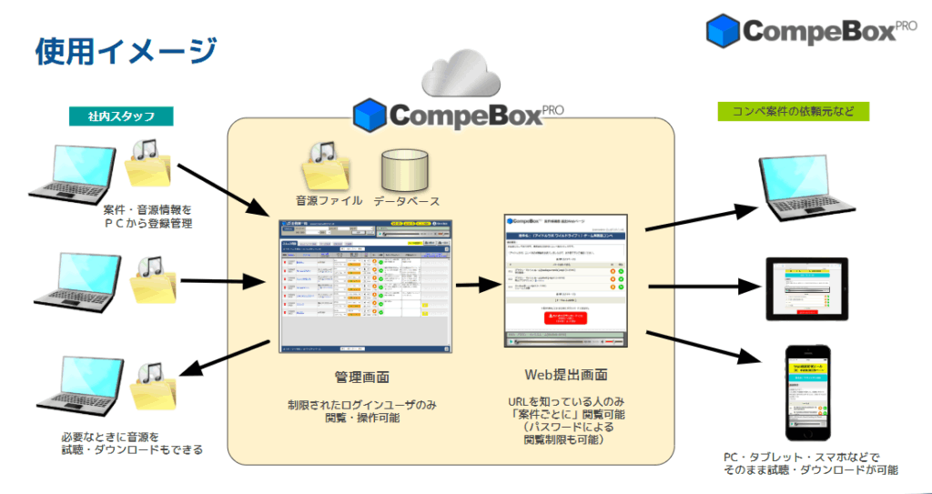 - 大量のコンペ・音源データを社内スタッフ間や社外との間で安全にクラウド共有できるため、ミス・紛失・エントリー事故等を極力防げます